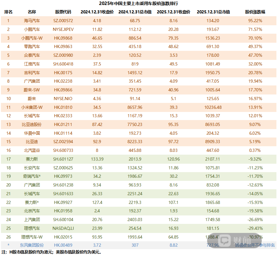 从股价来看,2025年海马汽车(000572.SZ)表现最为亮眼。公司以8.16元/股的价格收盘,股价几近翻倍(按2024年收盘价和2025年收盘价计算,下同),其间一度达到12.03元/股的高位。